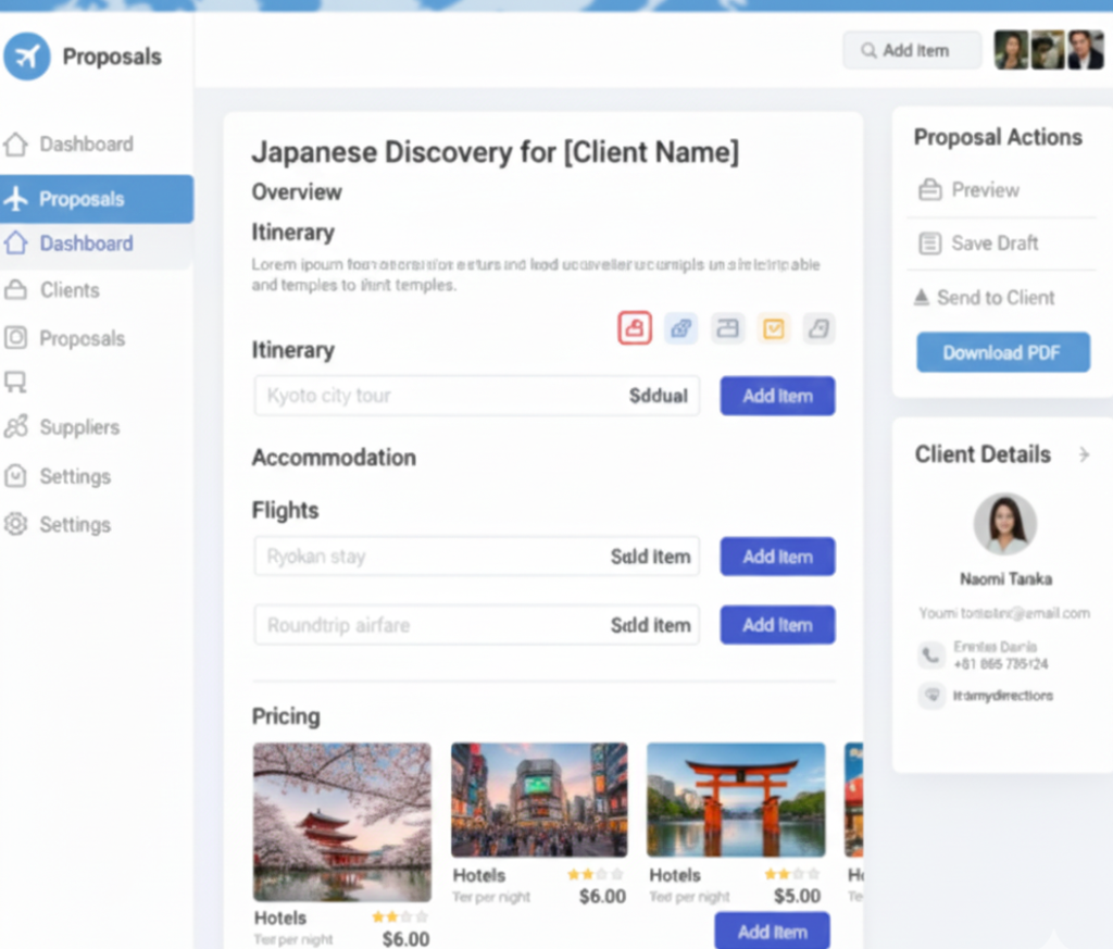 Elevate your travel planning with the ultimate itinerary builder for agents. Effortlessly drag, drop, and create stunning, custom-branded trips your clients will love.